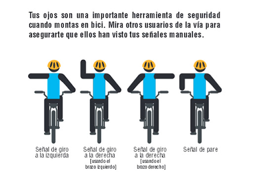 El ciclista necesita avisar sus maniobras por medio de señales manuales ya que no dispone de sistema de luces para ello. Estas señales, en todos los casos, indicarán: